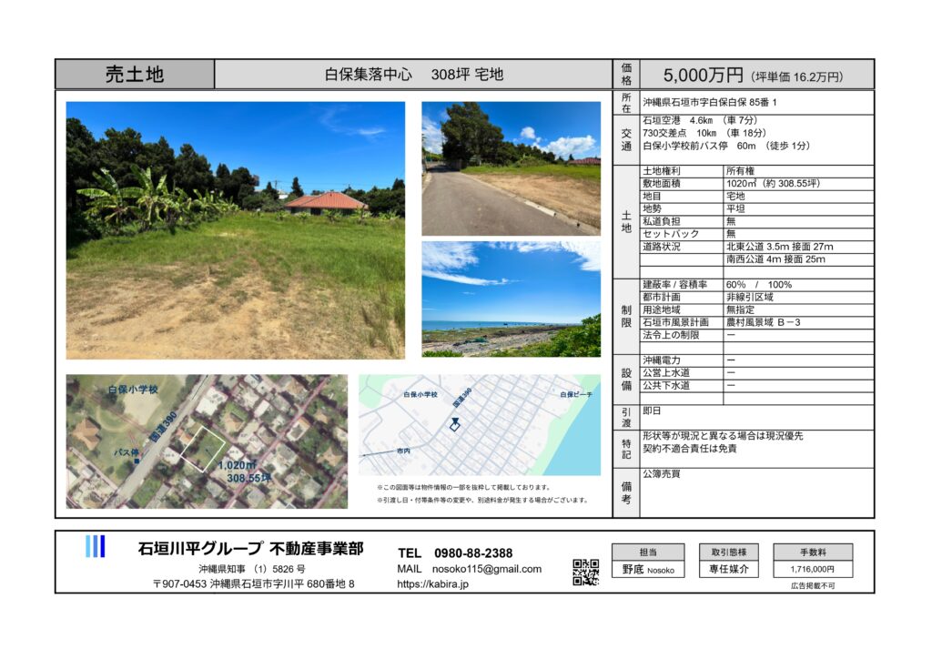【石垣島 不動産 土地売買情報】白保 集落中心の事業用地 308坪 5,000万円